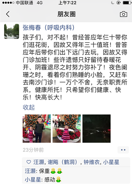 而提起自己的孩子们,广州市第一人民医院呼吸内科张梅春主任医师也是哽咽了,她在自己的朋友圈写道:“孩子们,对不起,曾经答应你们年三十带你们去逛花街,因故不得不值班;曾答应你们带你们出远门玩,因故不得不食言。些许遗憾只好留待春暖花开、阴霾退尽之时努力弥补了。夜色阑珊之时,看着你们熟睡的小脸,我却要赶车去南沙门诊了,虽有一万个不舍,无奈职责所系!只希望你们健康、快乐,快高长大!”