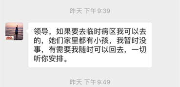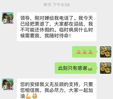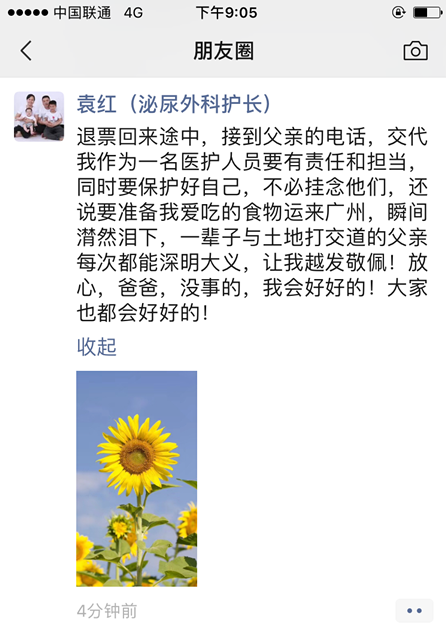 广州市第一人民医院泌尿外科护士长袁红,一早买好了和老公回湖北荆州过年的往返车票,接到医院召集护理人员支援发热门诊的通知后,立即报名,毫不犹豫地退了火车票。在退票回来的途中,她接到了父亲的电话,“父亲交代我作为一名医护人员要有责任和担当,同时也要保护好自己,不必挂念他们,还说要准备我爱吃的食物寄来广州。”袁红瞬间潸然泪下,“一辈子与土地打交道的父亲每次都能深明大义,让我越发敬佩,我在心里默默地说,我一定会好好的,大家都会好好的。”