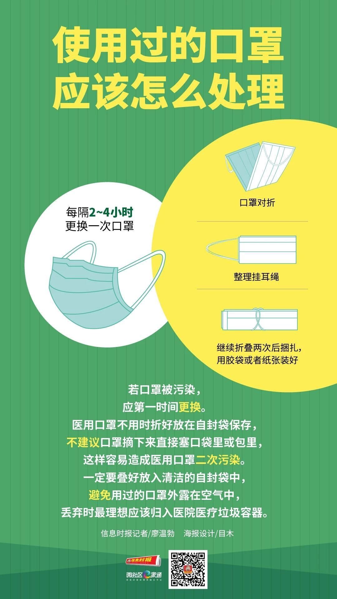 A:广州市疾控中心发布脱口罩科普,强调一次性口罩在脱下和丢弃时,也有讲究。须动作轻柔脱下并收折,妥善存放后再丢弃,过程中要避免手部触碰口罩外侧和扬起可能的沾贴于口罩上的飞沫。切忌把使用后的口罩放入袋中。此外,对于有感冒、发烧、咳嗽症状的人,用过的口罩需用开水或至少56℃以上的热水浸泡30分钟,或用酒精喷雾消毒后密封丢弃到“有害垃圾”桶。