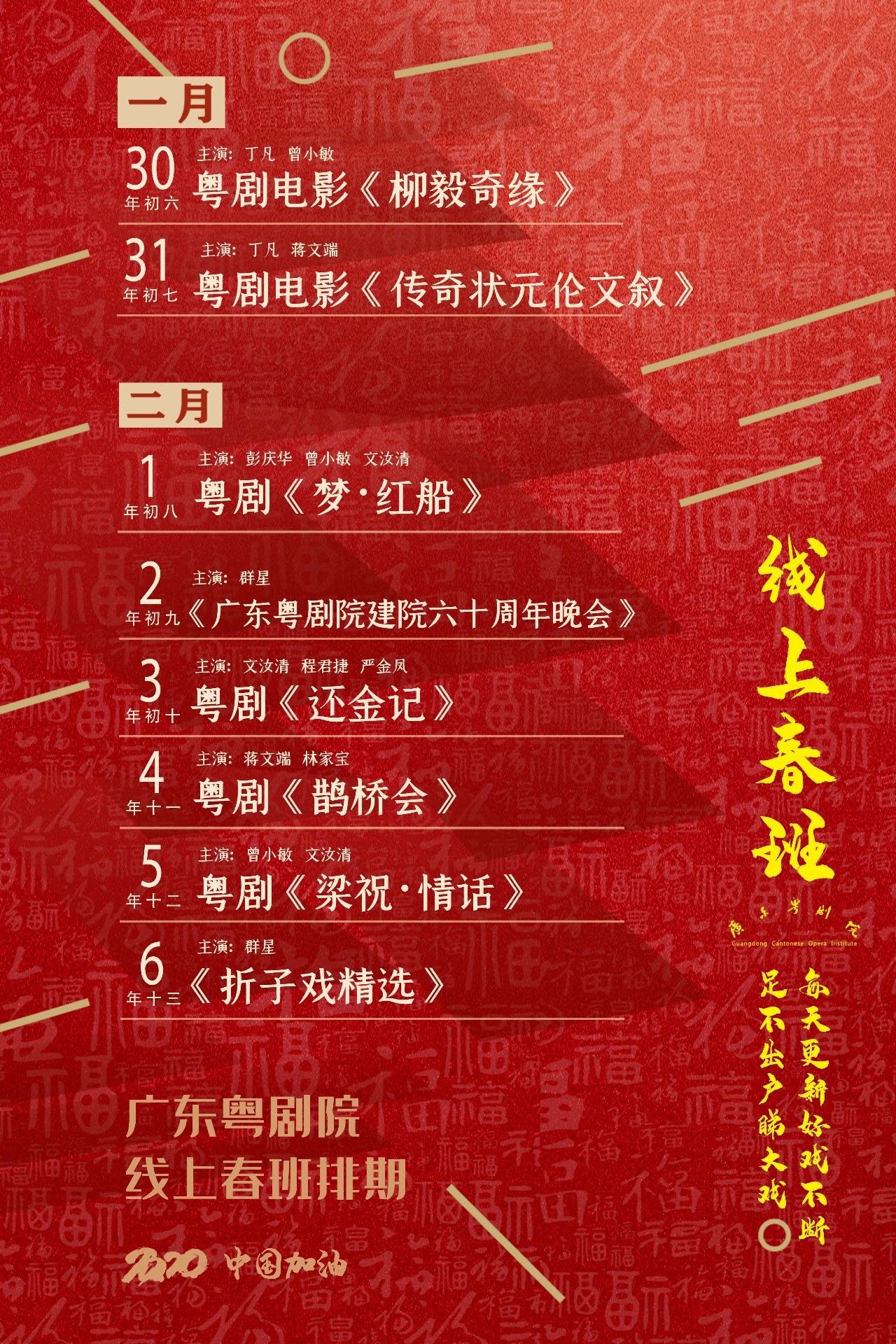 1月30日,由粤剧电影《柳毅奇缘》打头阵,“线上春班”会陆续带来粤剧电影《传奇状元伦文叙》、粤剧《梦.红船》、《广东粤剧院建院六十周年晚会》、粤剧《还金记》、粤剧《鹊桥会》、粤剧《梁祝.情话》、《折子戏精选》。与以前不同的是,这次放出的是全剧,诚意十足。