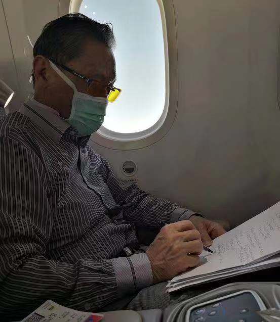 尽管一直都在马不停歇的工作、赶路、交流,但即使上了飞机,他依旧在坚持工作,研究危重病人的治疗方案,并认真做着记录。