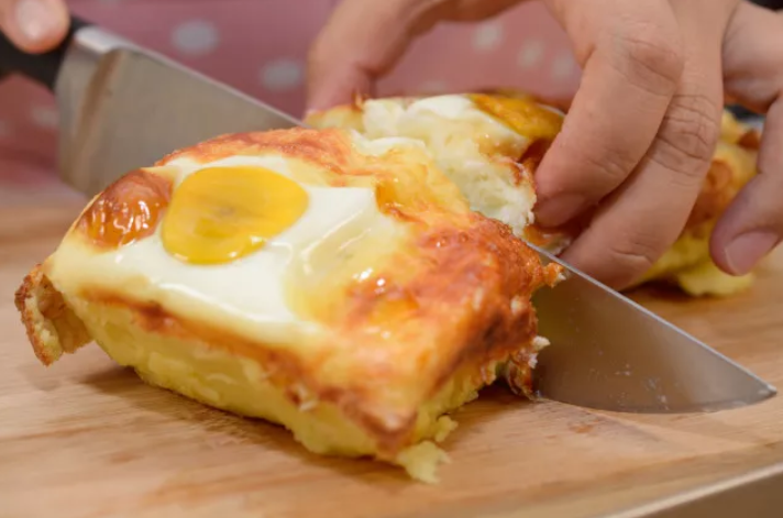 7、看到蛋糕表面的鸡蛋呈现微微焦黄状,就可以出炉了。此时,可用饭勺等工具把蛋糕撬出来,最后用刀切块即可食用。