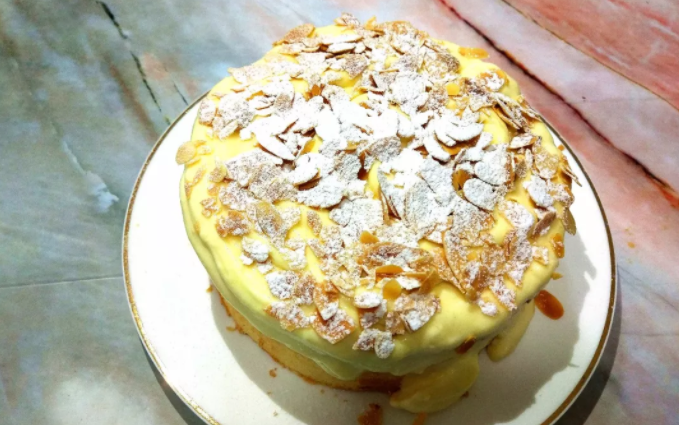 6、最后点缀,做好之后,在蛋糕的表面撒上一层烤好的杏仁片,再在杏仁片上面撒一些糖粉即可。