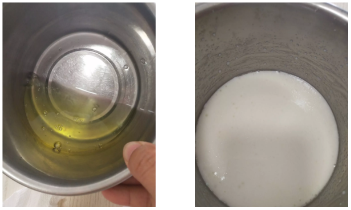 在做戚风蛋糕的时候,首先要将牛奶和油一起打均匀,直至打到看不到油星沫为止,而且还要有方法地打,不要转圈圈的方式,因为转圈圈打,就会出现泡泡,这会影响到蛋糕的成品。