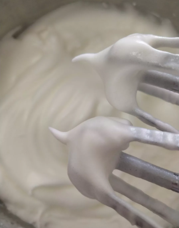 蛋白打发得好不好,决定了蛋糕的成败。所以,蛋白打发是非常关键的。在打发蛋白之前,先将白糖打成粉末,如果没办法打成粉末,可以在细砂糖里稍加5克玉米淀粉(这个量是做6寸蛋糕体的)拌均匀。滴上几滴柠檬汁,用打蛋器打上几下,出现大泡沫之后,加入三分一的糖,继续高速打发,再加入三分一的白糖,同样高速打发。最后加入三分一糖后,就转为低速打发,在打蛋器提出来的时候,出现小小的弯勾,蛋白就打好了。