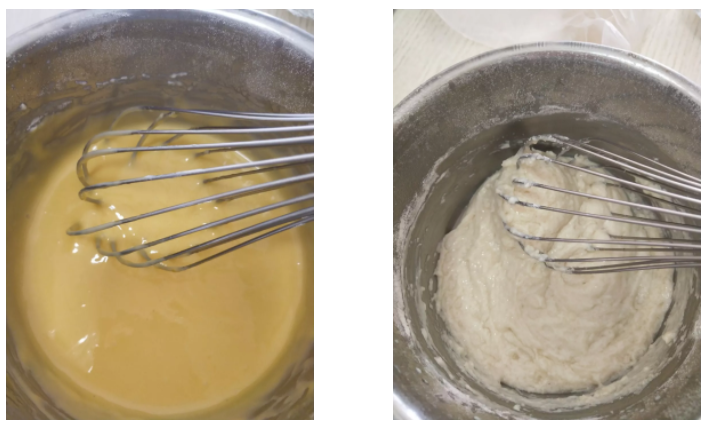 面粉筛入之后,要往一个方向打,这样避免泡泡产生。然后蛋黄倒入到刚刚拌好的面粉里,此时还是只能往一个方向来打均匀蛋黄,用后蛋法是避免起筋,蛋糕的口感会更好。