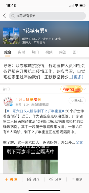 而由@广州日报在新浪微博发起的#花城有爱#话题,则邀请广大网友关注前线医护人员的驰援日记,大家纷纷留下祝福,分享发现的身边感人故事,以及配合疫情防控宅家过年的新方式,阅读量已达近2000万。(话题传送门)
