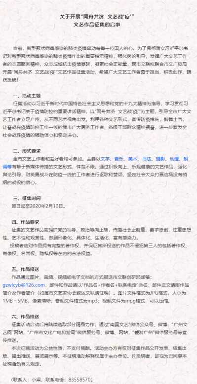 从春节开始,广州市文联“南国文艺”微信公众号 、微博、“广州文学艺术网”和《广州文艺家》联合推出“同舟共济 文艺战‘疫’”创作专栏,面向全市文艺工作者征集关于疫情防控等相关主题的文艺作品,希望广大文艺工作者勇于担当,积极创作,踊跃投稿。