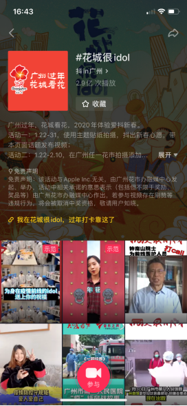抗疫进行时,广州人纷纷响应政府号召、宅在家里过年。因此,抖音特别邀请广大用户参与线上的“花城很Idol(爱抖)”抖音挑战赛,拍摄视频致敬医护人员,传递温暖心意;或者邀请家人使用新年贴纸一同拍摄视频,记录宅家过年的百般才艺和休闲娱乐活动。目前该话题发布量已达1万个,浏览量达2.9亿。(活动传送门)