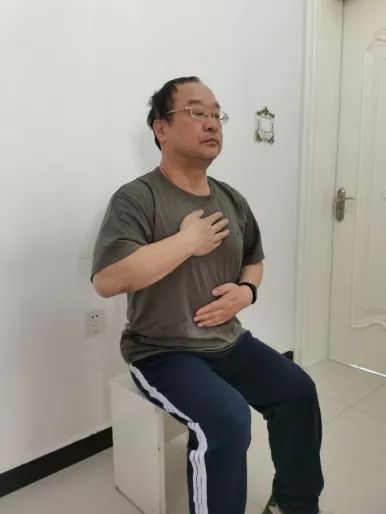 双手放置于腹部,吸气时腹部向上隆起,呼气时腹部下降。