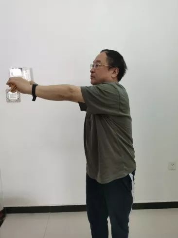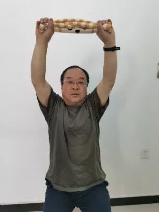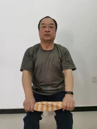 双手横握毛巾,与肩同宽,双肘伸直,吸气时上肢上举,呼气时上肢放下,通过上肢的运动增加胸廓的活动度和进气量。