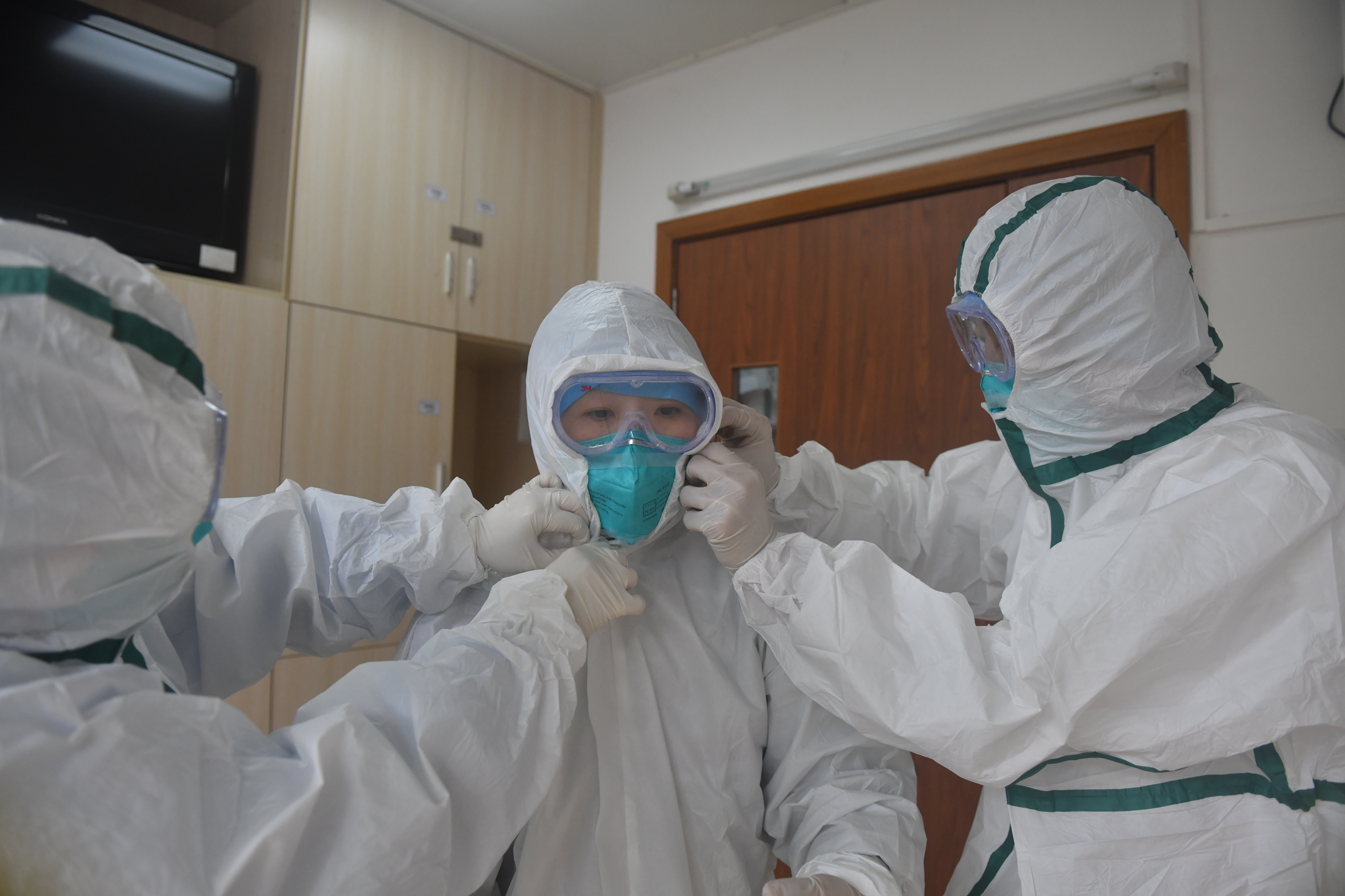 以进出隔离病区为例。洗手、戴N95口罩、两层帽子,套上护目镜,检查防护镜是否起雾,确保气密性后戴两层手套,穿连鞋防护服,套上水鞋,再穿上一套隔离衣,个子娇小的人在脖颈处还要围上一层塑料薄膜……要经过至少十道程序,花费半个小时。