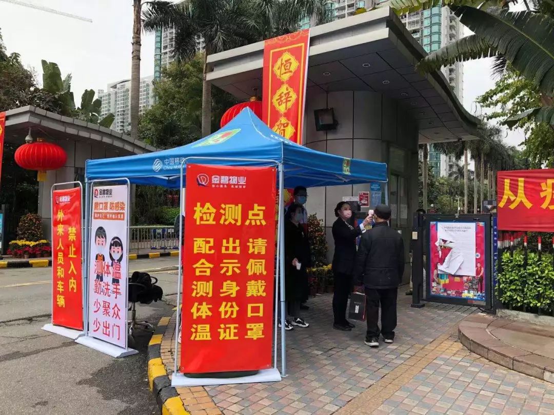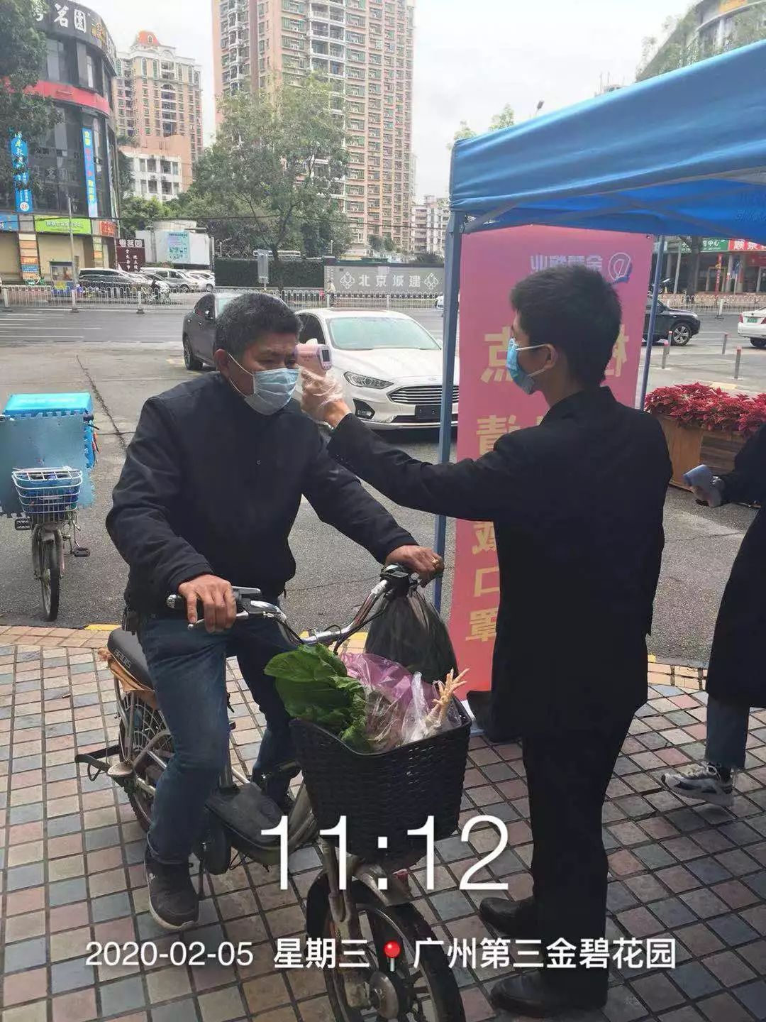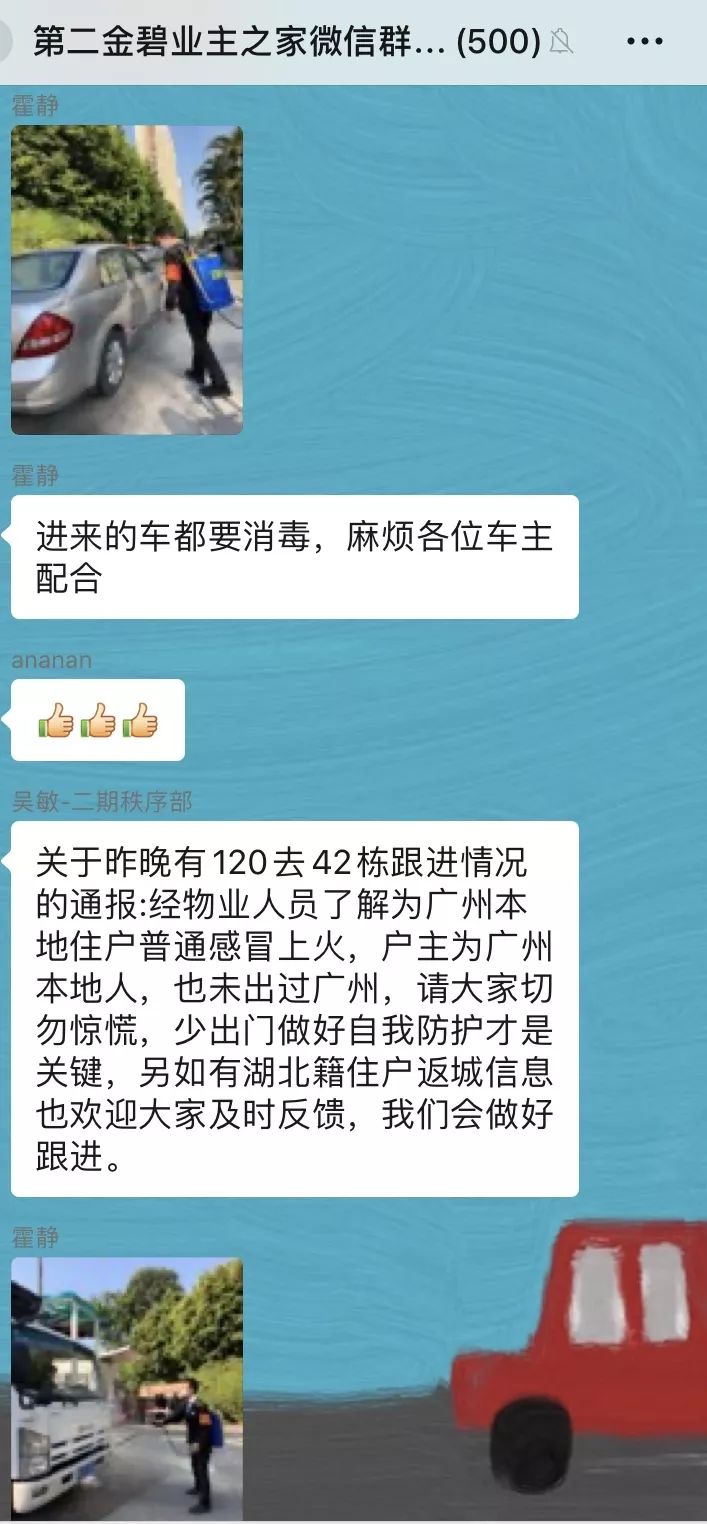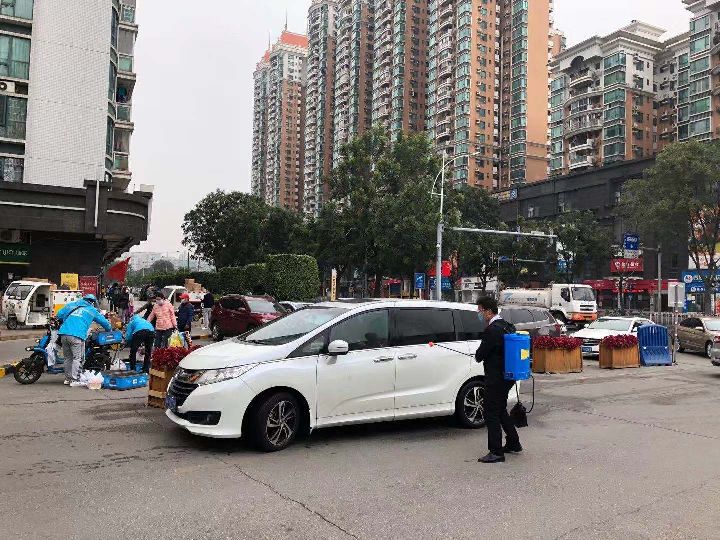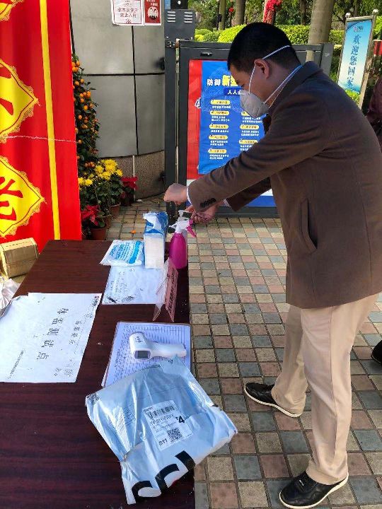 在小区出入口,物管人员每天24小时值守,党员志愿者协助,对进入小区的住户逐一进行测体温检查,发现发热症状立即通知街道和社区卫生服务中心处理,同时做好返穗住户、进出车辆信息登记。同时,第二金碧花园住户、车辆进入小区时要进行消毒;第三金碧花园进入车辆也需消毒,并给住户喷酒精、提供免洗洗手液。