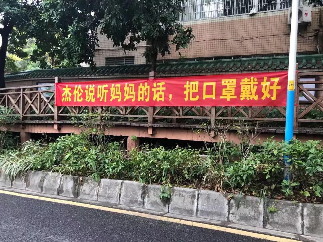 为做好防控新型冠状病毒的宣传工作,广州各街道在很多地方挂起宣传横幅。近日,记者在广州市的华侨外国语学校外就见到了这样一幅让人眼前一亮的横幅标语——“杰伦说听妈妈的话,把口罩戴好”。