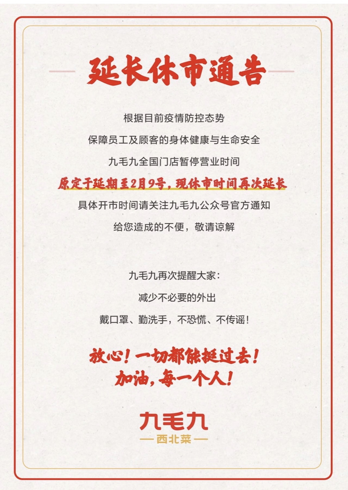 此外,为积极开展疫情防控措施,从门店端口杜绝聚餐,多家餐饮店也纷纷发布所有门店暂时停业的公告,其中不乏九毛九、西贝、海底捞等备受市民喜爱的网红店。