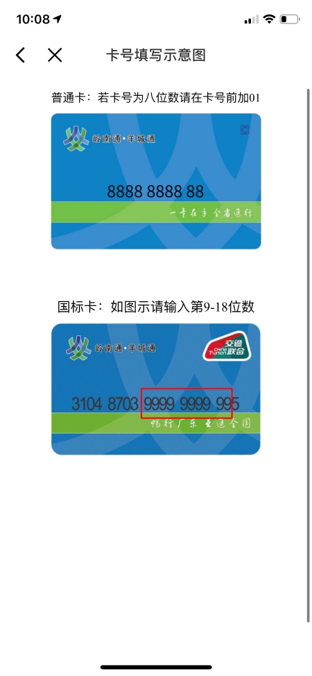 在填写羊城通卡号时,若是卡号为八位数的普通卡,需要在卡号前添加01,若是卡号为19位的国标卡,则输入9到18位数字。