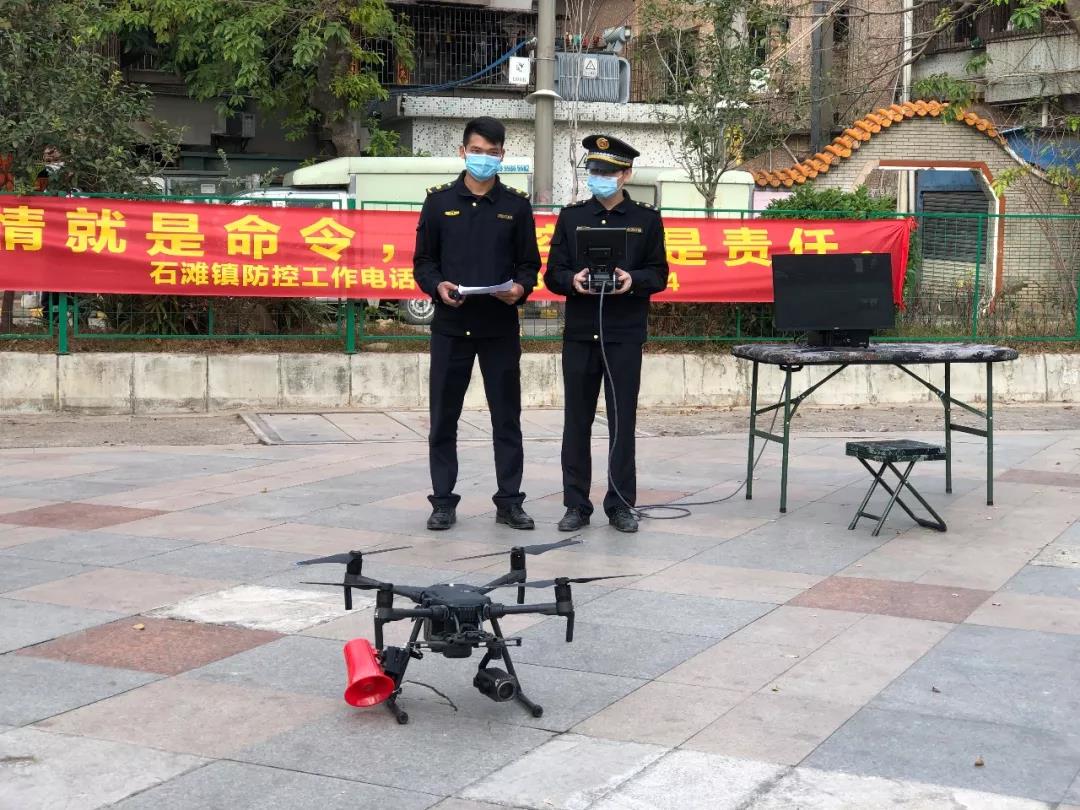 石滩镇利用无人机巡视广播宣传防疫知识,并劝导市民少出门、戴口罩、不聚集。城管中队工作人员实时操控,利用无人机在石滩镇和兴市场、解放南路等人员聚集地上空来回“巡逻”,遇到出门溜达的市民,机上的小喇叭马上“喊话”,劝导市民少出门、戴口罩、不聚集。