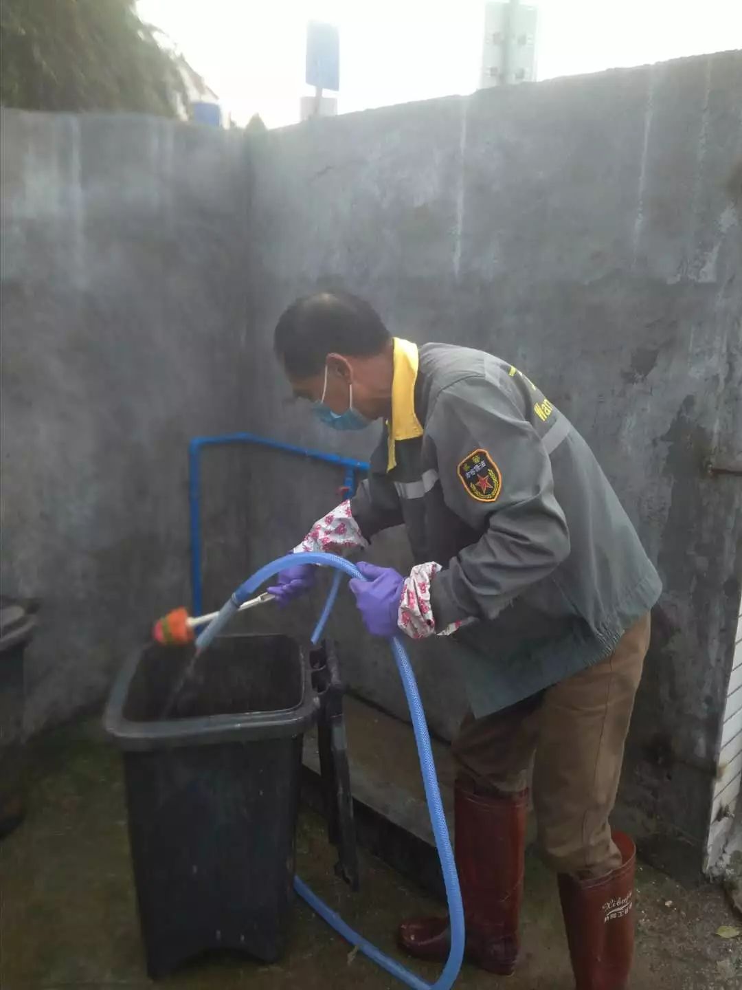 ▲保洁人员对垃圾桶内外进行仔细地清洗和消毒。