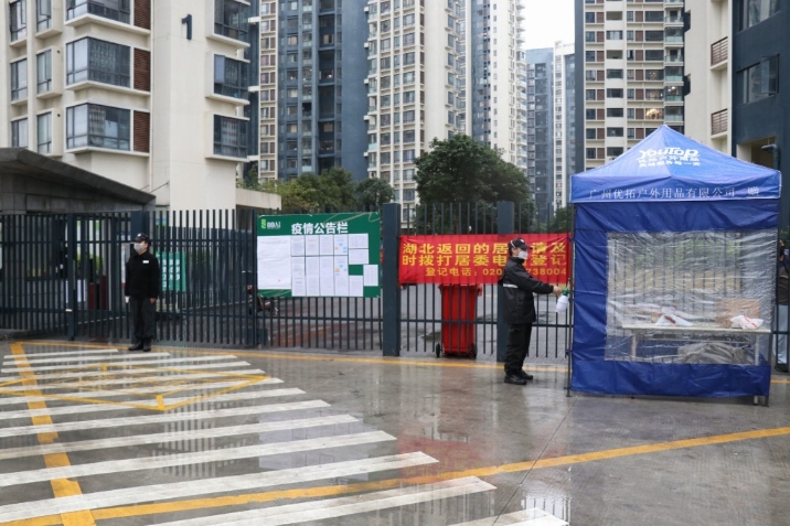 近日,广州市海珠区凤阳街道的一个小区也采取了封闭管理模式。此前快递员是可以送快递上门的,也有的将快递寄存在保安室。现在,小区门口露天位置摆放了一张桌子,专门存放居民的快递,快递员禁止进入小区。遇上下雨的情况,小区保安会将快递转放在能遮雨的地方。小区保安告诉记者,这张放快递的桌子每日都会进行两次消毒。而下雨天,在转移快递之前,保安会先将空地用消毒液喷洒一次,再放快递。