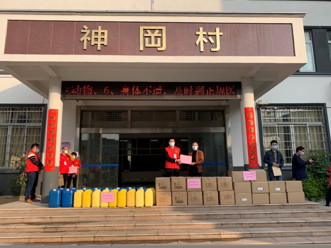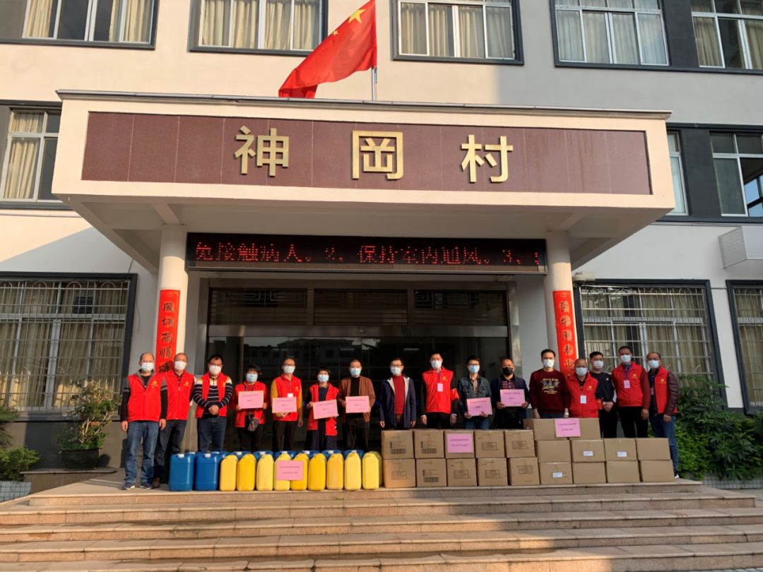 ▲2月13日,广州久盈城建咨询有限公司向神岗村捐赠外科口罩10000个、医用酒精2000支、消毒药水20桶以支持村疫情防控工作。