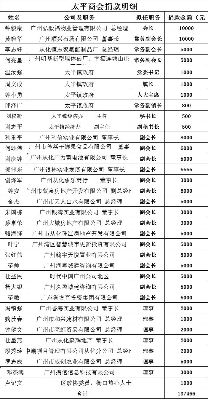 在疫情防控中,从化区人大代表、太平镇商会会长、太平镇弘毅物业管理有限公司总经理钟毅康充分发挥党员的先锋模范作用,捐资10000元,同时倡议党支部党员和商会会员进行募捐。太平商会1月31日向从化区慈善会捐资55000元,截至2月13日,共募捐资金137466元供太平镇政府购买口罩、体温枪等防疫物资及相关防疫工作使用。另外,商会会员向各村捐资捐物支援防疫工作,合计金额80800元、84消毒液108桶、洗手液29箱、口罩74200只、75%酒精2030瓶。
