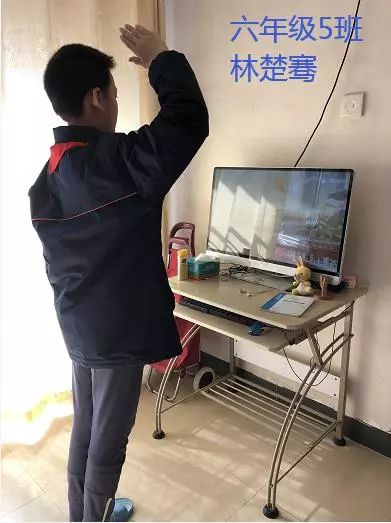随后,学生们开始锻炼身体。早上8时多,晓港湾小学三年级4班学生刘一畅正在压腿、伸腰,进行锻炼。9时,他端坐在电脑前,开始上第一节语文课,观看视频《鹿角和鹿腿》。课程结束后,刘一畅做起了眼保健操。