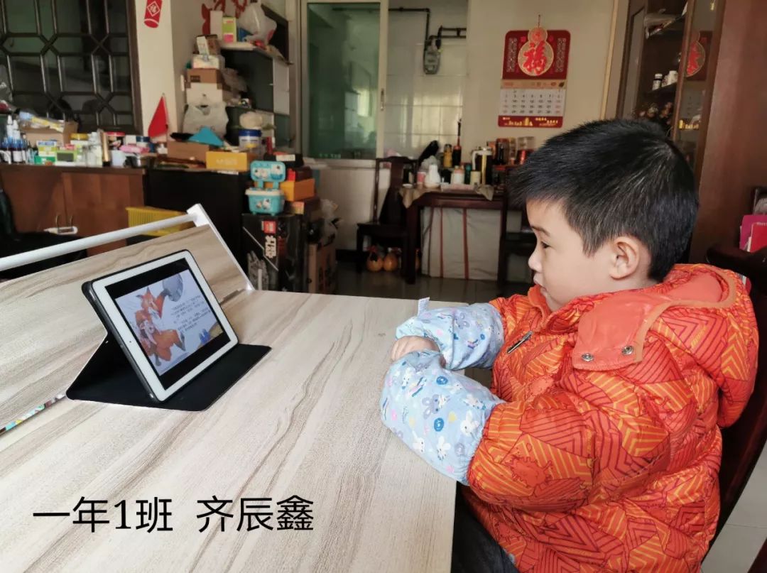 ↑四年级3班学生陈颢文的妈妈前往武汉支援,他在家线上学习。