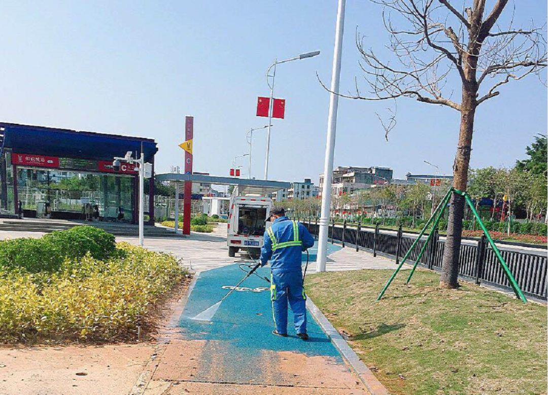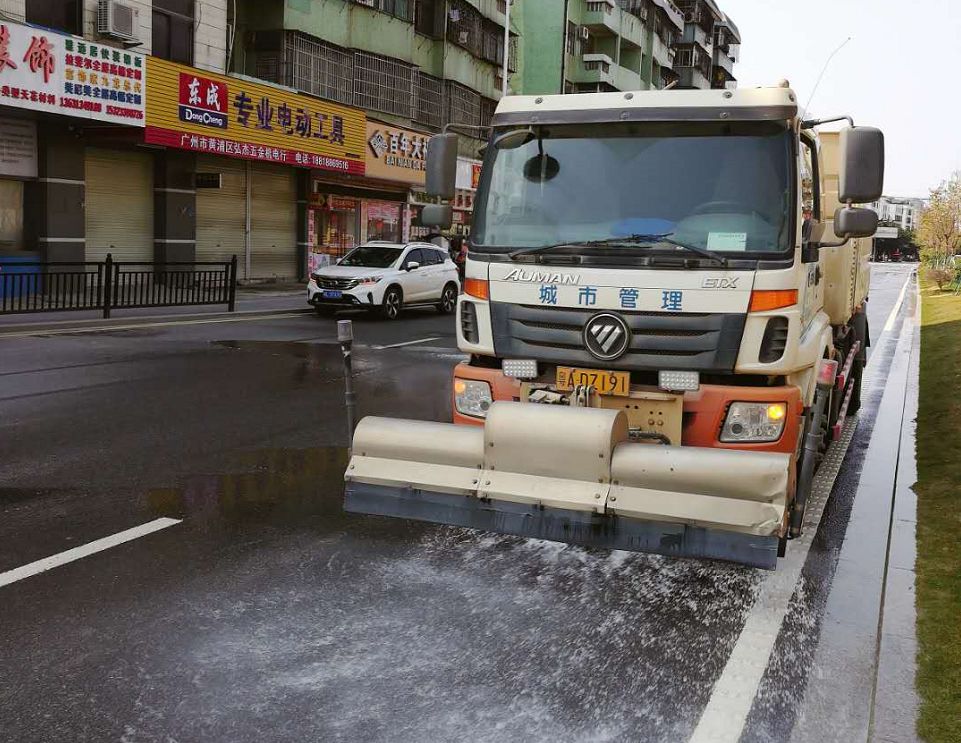 清洁完这些细节部分,接下来是主干道的卫生清洁,我们平时会派出大型洒水车冲洗,同时我还会用高压水枪对其仔细冲刷。