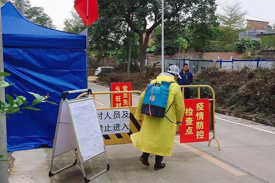 除此之外呀,我们还成立了一支专门的消杀队伍,每天在各个村的防疫点、公交站、办公室等人流密集公共区域进行巡回消毒。