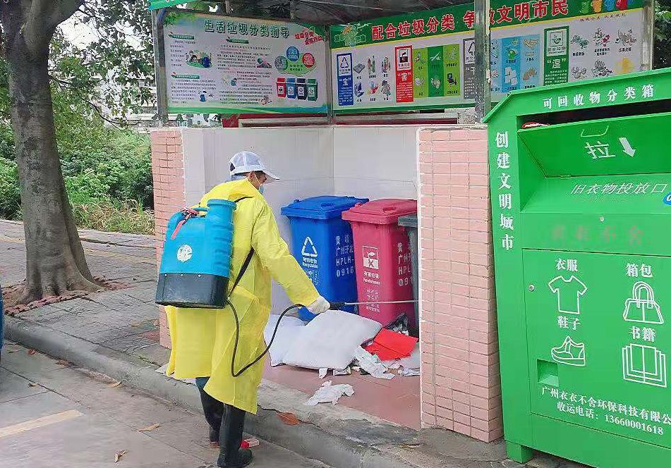 社区、道路旁常见的垃圾桶也是保洁工作的重点,清空桶内的垃圾后,还需要认真地擦拭垃圾桶,并喷洒消毒液。