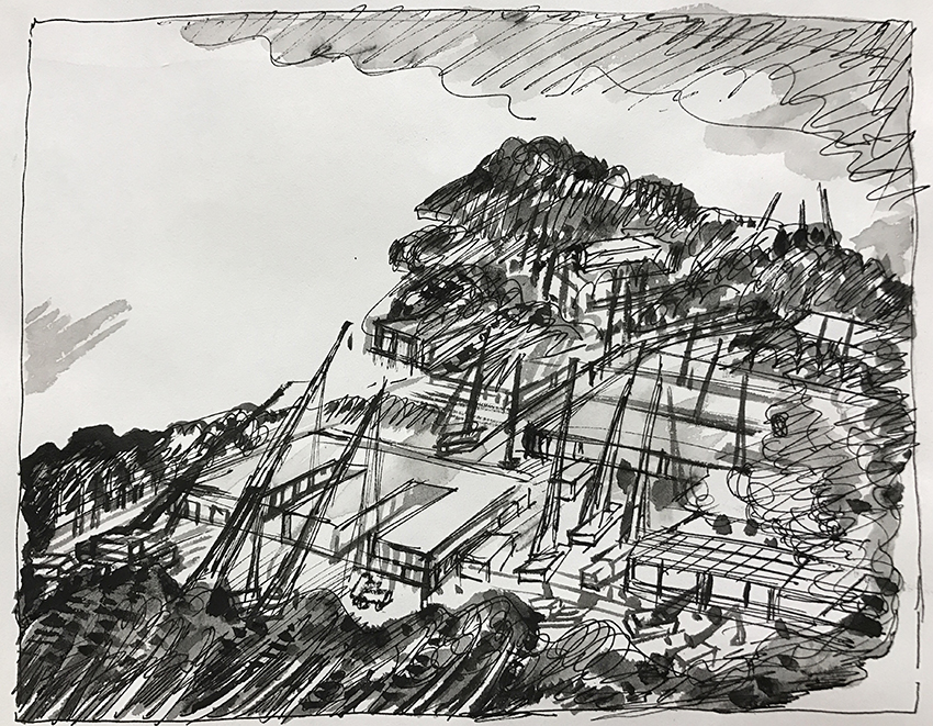 在构思过程中我特意用全景式的构图,以尽力体现工程的宏大与气势。以众机械吊臂与耸立的建筑及山体喻国人齐心协力战疫的气度,画中的气象与曙色展现人类必胜的信念。