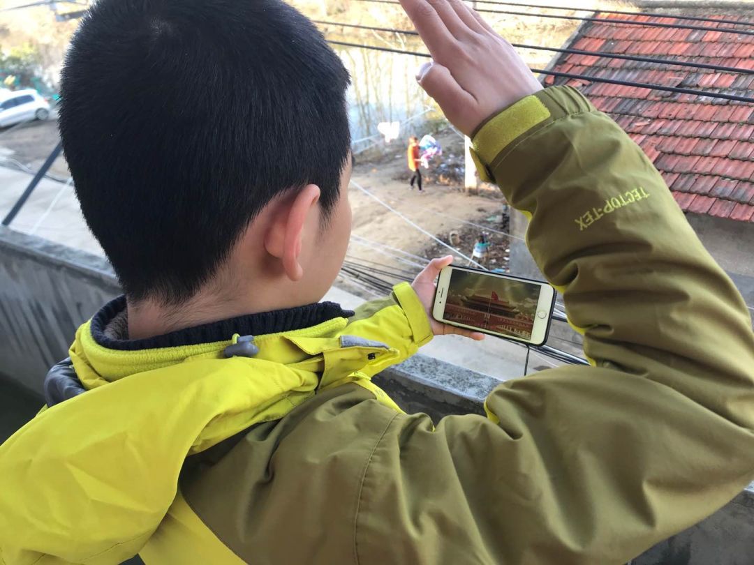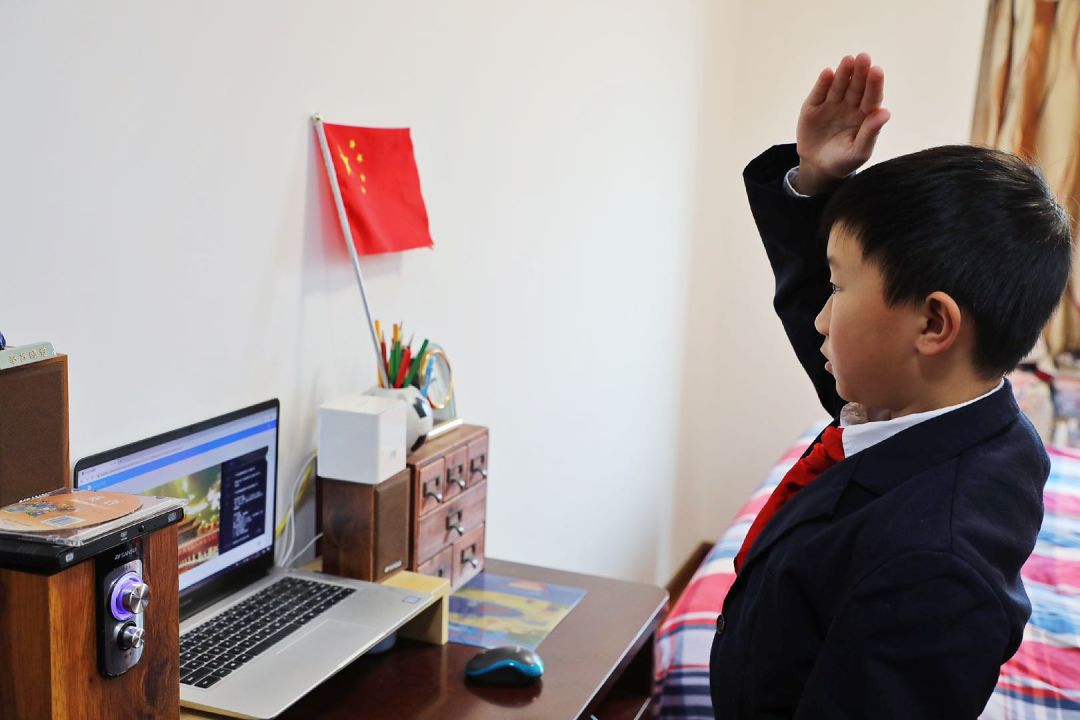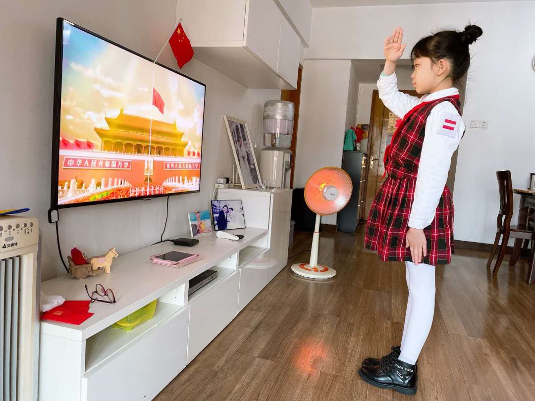 虽然不是在升旗台下,同学们依然庄重对待。大家穿戴整齐,和以往在操场上一样专注地敬队礼、唱国歌。红火炬小学二年级学生李诗妍因为还在老家乡下,身边没有校服,还是特意找姐姐借了一条红领巾,佩戴好后才参加升旗仪式。