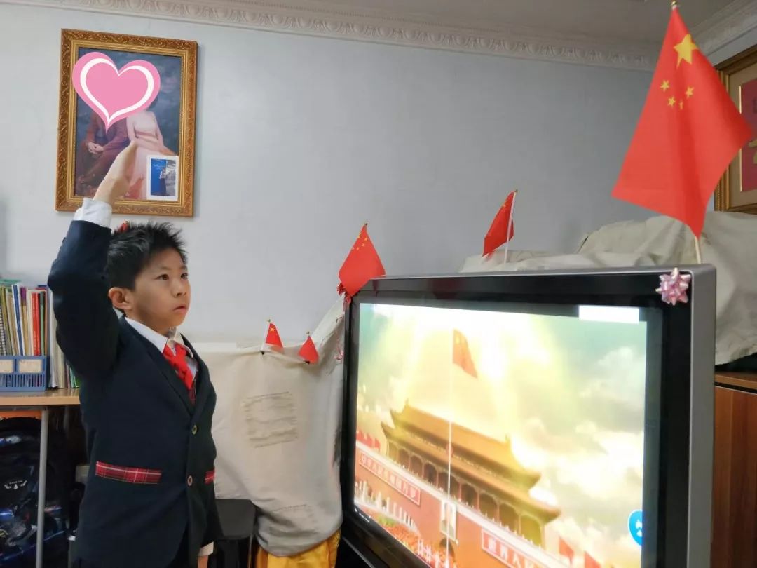 在湖北黄冈的罗琦同学:这是我第一次在湖北参加这么特别的升旗仪式,隔离病毒不隔爱,同一时间不同地点我们一起唱国歌一起向国旗敬礼,太开心了!