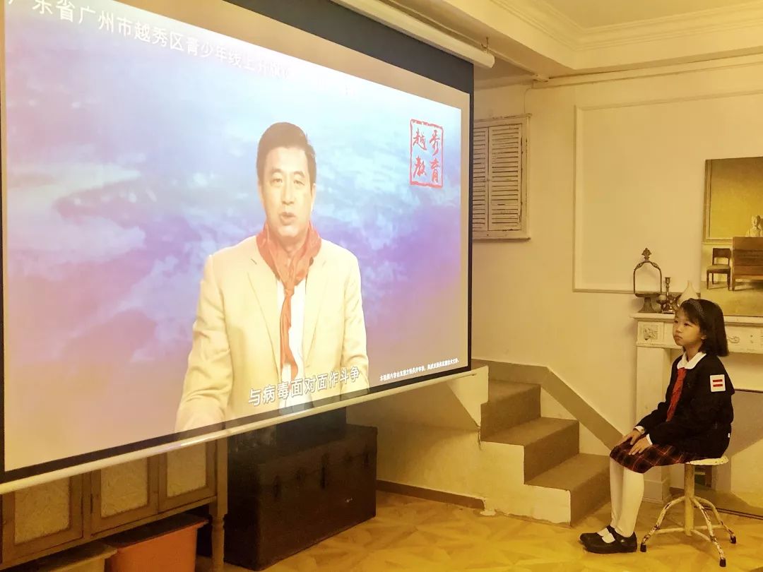国旗下,战斗在疫情一线的广州市第八人民医院感染病科主任蔡卫平给越秀区全体师生们演讲,他告诉同学们要认真居家学习,同时“注意防疫,注意个人卫生,尽量不出门”。