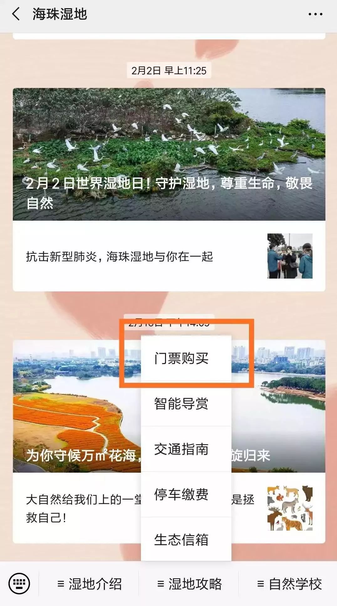 点击菜单栏“湿地攻略”—“门票购买”,门票仅限当天购买当天使用。