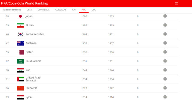 在最新一期的榜单中,中国队与排名第70位的伊拉克队有21分的差距。在亚足联的排行榜上,日本队作为亚洲球队中排名积分唯一在1500分的队伍,自然也占据第一宝座,总排名也是唯一跻身前30的亚洲队伍。伊朗队、韩国队、澳大利亚队和卡塔尔队依次列亚洲第二至第五位。目前,中国队落后身前的阿联酋队有11分的差距,而领先亚洲第十的叙利亚队分差仅为9分,而今年的40强赛国足将在6月份与叙利亚上演关键一战。