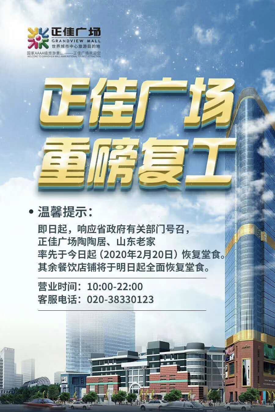 继陶陶居、山东老家等餐企宣布恢复堂食后,正佳广场发布消息称,今日起恢复全面恢复广场内所有的餐饮店铺。