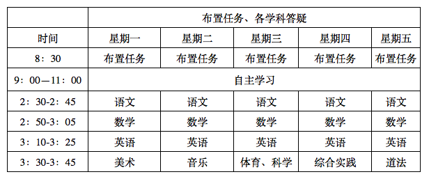 各班老师将采用“在线上布置任务、推送学习资源(符合五育并举要求、要量化)——学生自主学习——教师在线答疑解惑(教师定时、不定时在线解答)——教师检查反馈”的模式。