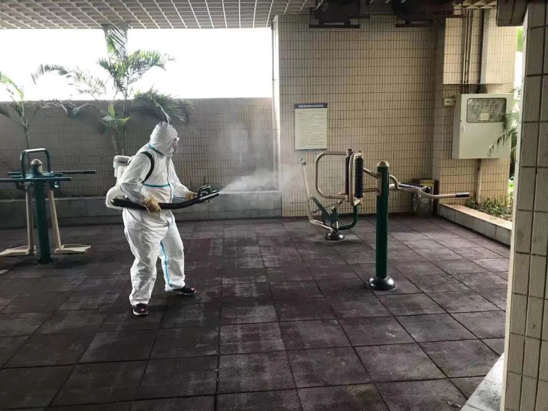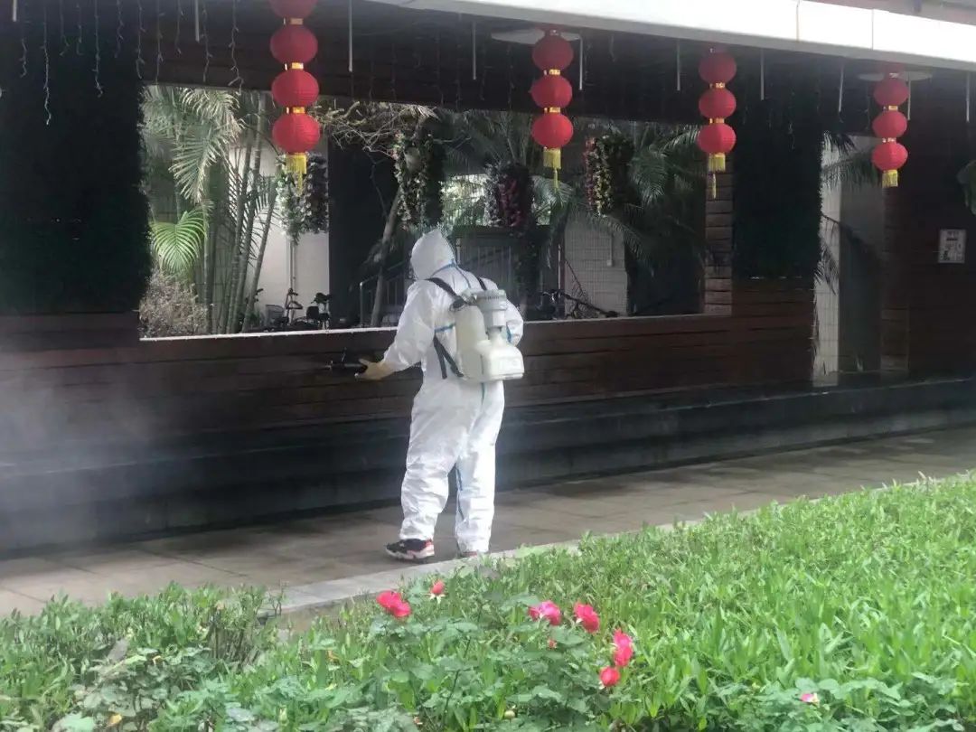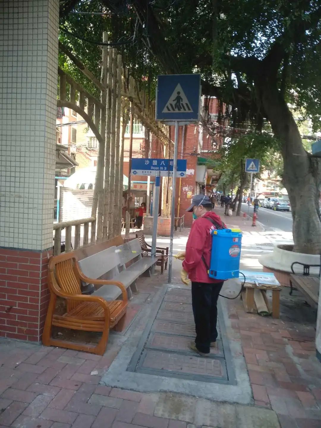 沙园街辖内出现确诊病例后,他们每天都要对发生疫情的小区进行重点消杀。闷在蒸笼一般的防护服里,背上的消毒设备重达50斤,喷洒完两桶消毒水需要将近两小时,但他们一直坚持着,没有一个人叫苦叫累。