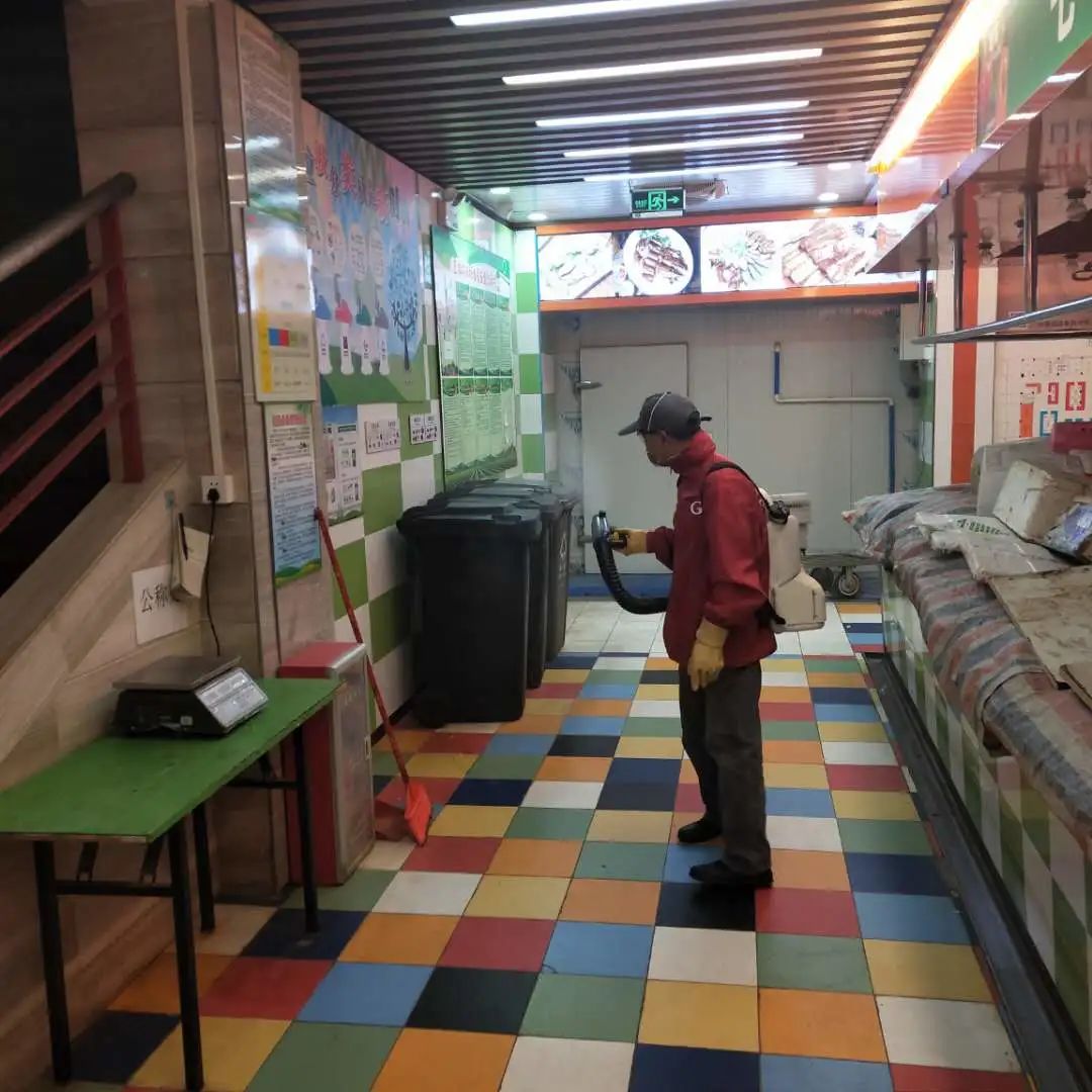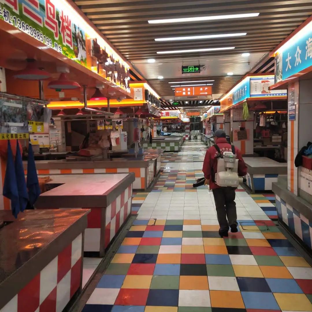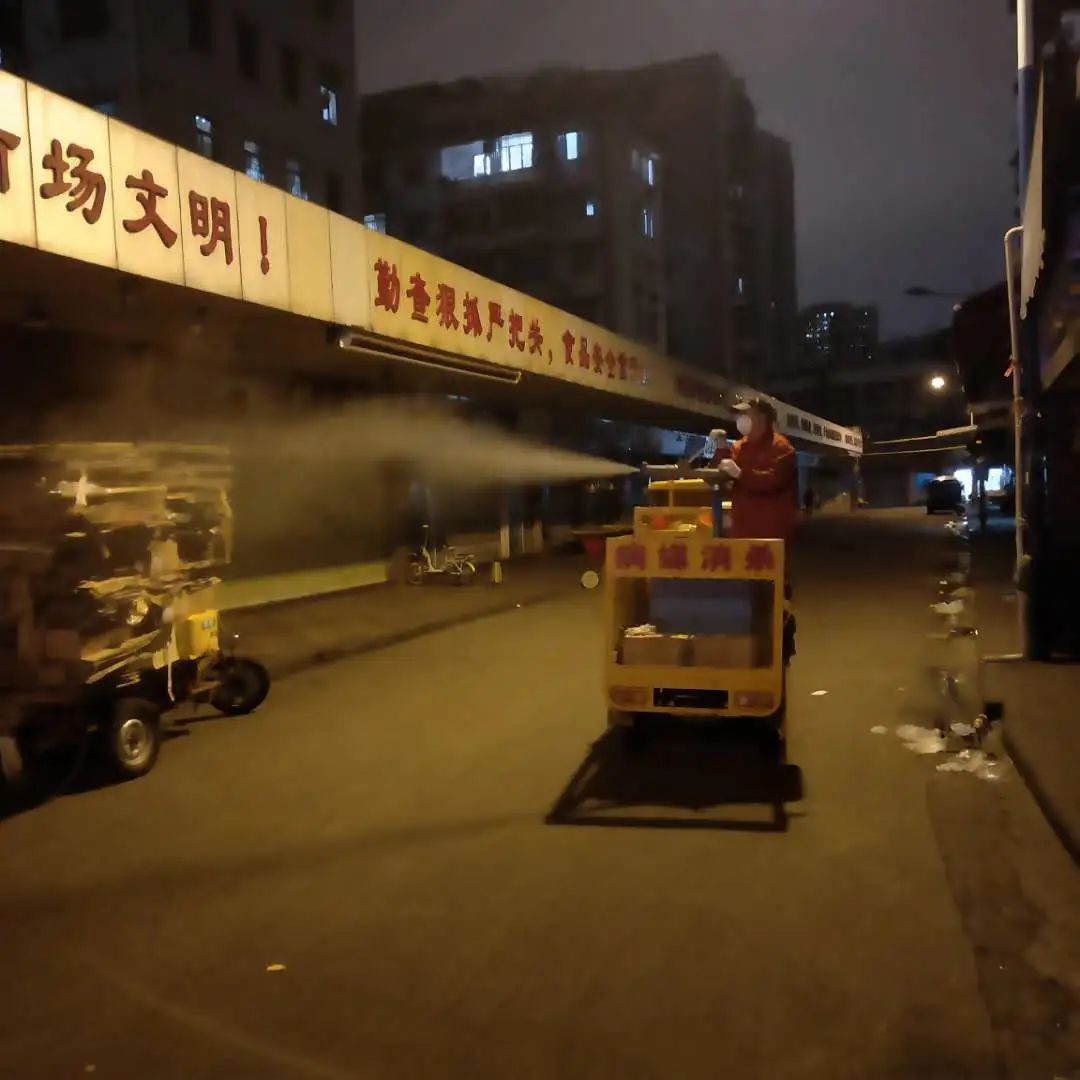 战“疫”快一个月了,唐青海印象最深刻的还是连续奋战一星期的市场消毒。白天,他们走街串巷,在政务服务中心、公园、垃圾处理点、市场周边消杀,晚上等市场收市、所有人员离开时,这里又成为他们的“主场”。