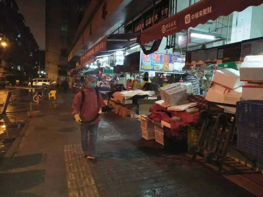 尽管有车载式药物喷雾机减轻他们的工作量,但在一些边边角角,还是需要人工喷洒。偶尔买菜的街坊,或许未能感受到市场面积之大。消杀人员每晚逐个档口喷洒消毒水,真正走遍了每一个角落。“我们的工作要求是不放过任何一个死角。”