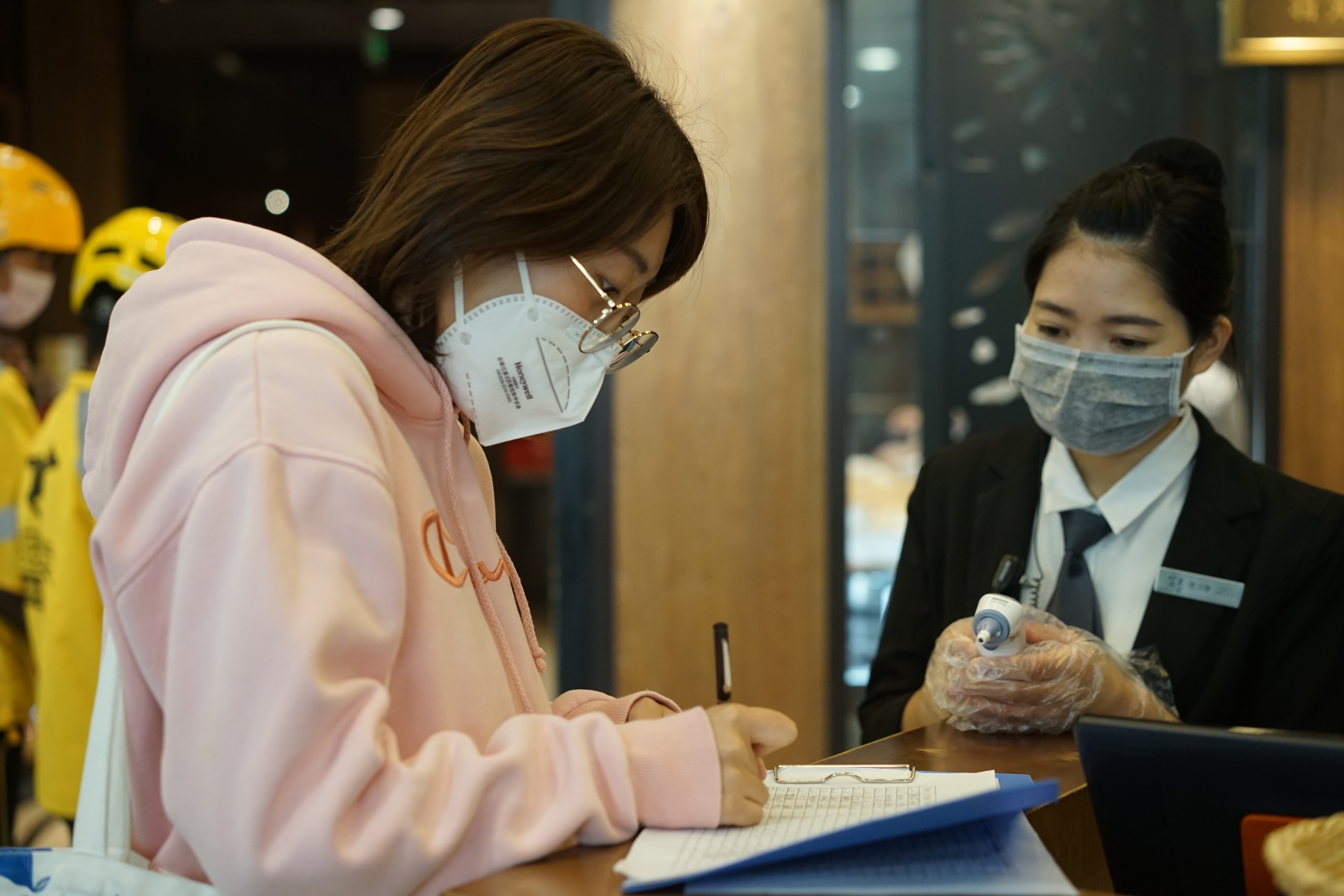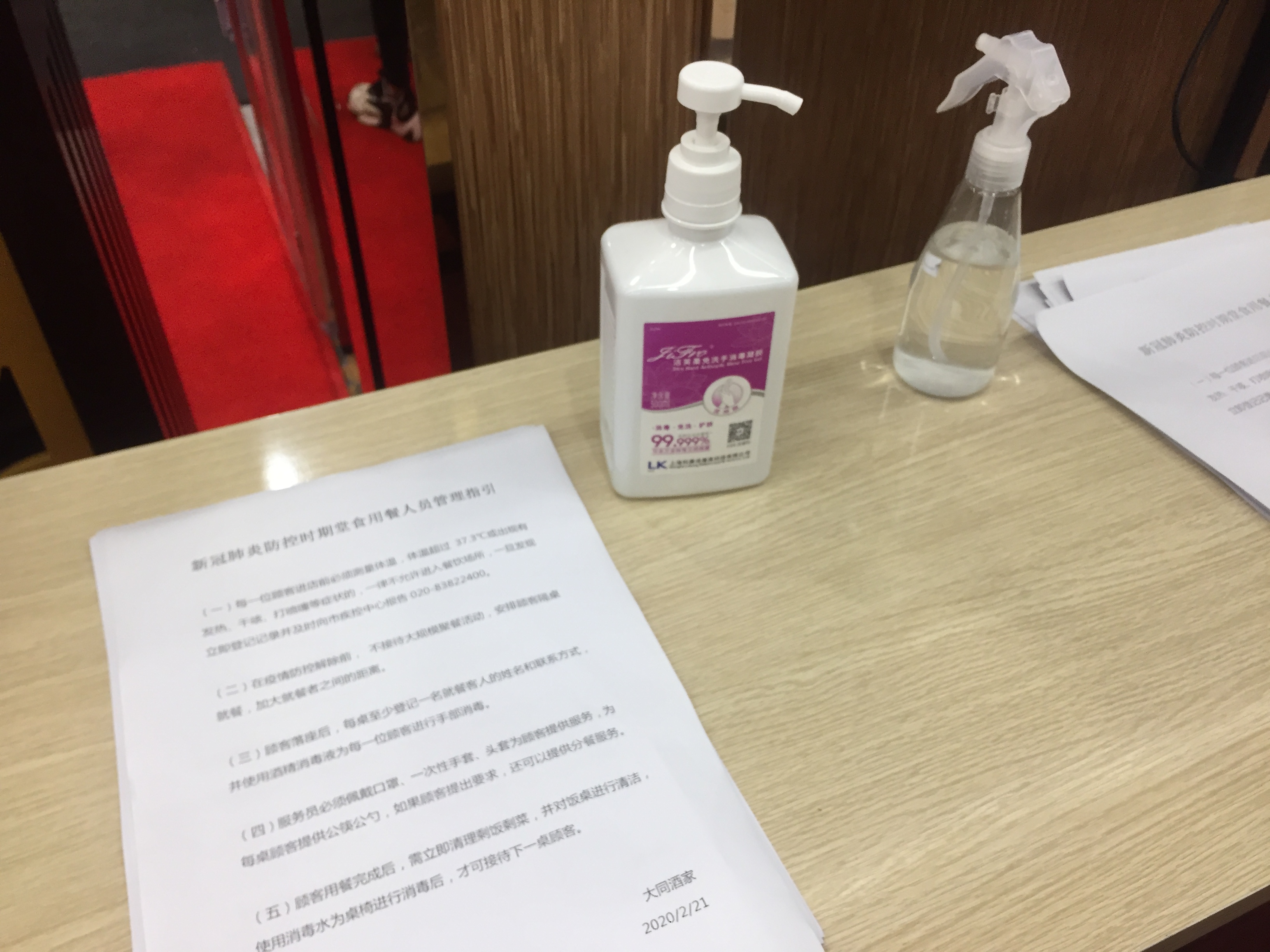 在番禺区“祈福酒店”的中餐厅祈福轩门口,地毯经消毒。记者见到凡是欲进入餐厅用餐者,在酒店门口先要接受保安人员测量体温,并作登记。桌面贴上有红白两种颜色的“告示”,用大字体提醒来者“戴口罩、测体温”,一旁还放置着免洗消毒液供使用。过了这一关,来到中餐厅入门处,有服务员再次为来者测体温,并做登记,要求每张台至少须有一位市民登记联系方式,做好报备工作。