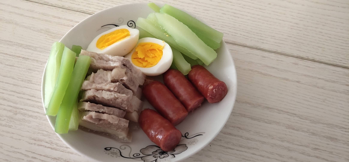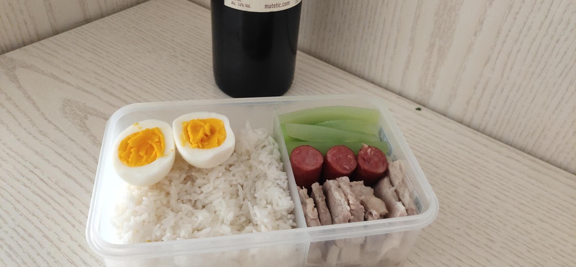鸡蛋煮熟,对半切,香肠在煮饭的时候就一起放在饭面上蒸熟,水里放姜片,盐煮开后放入五花肉,煮大约20分钟左右,煮好拿出来,切成薄片。莴笋切成丝后用盐腌一下,然后也过一次水,捞出来。然后将上面的菜一起装在饭盒里。
