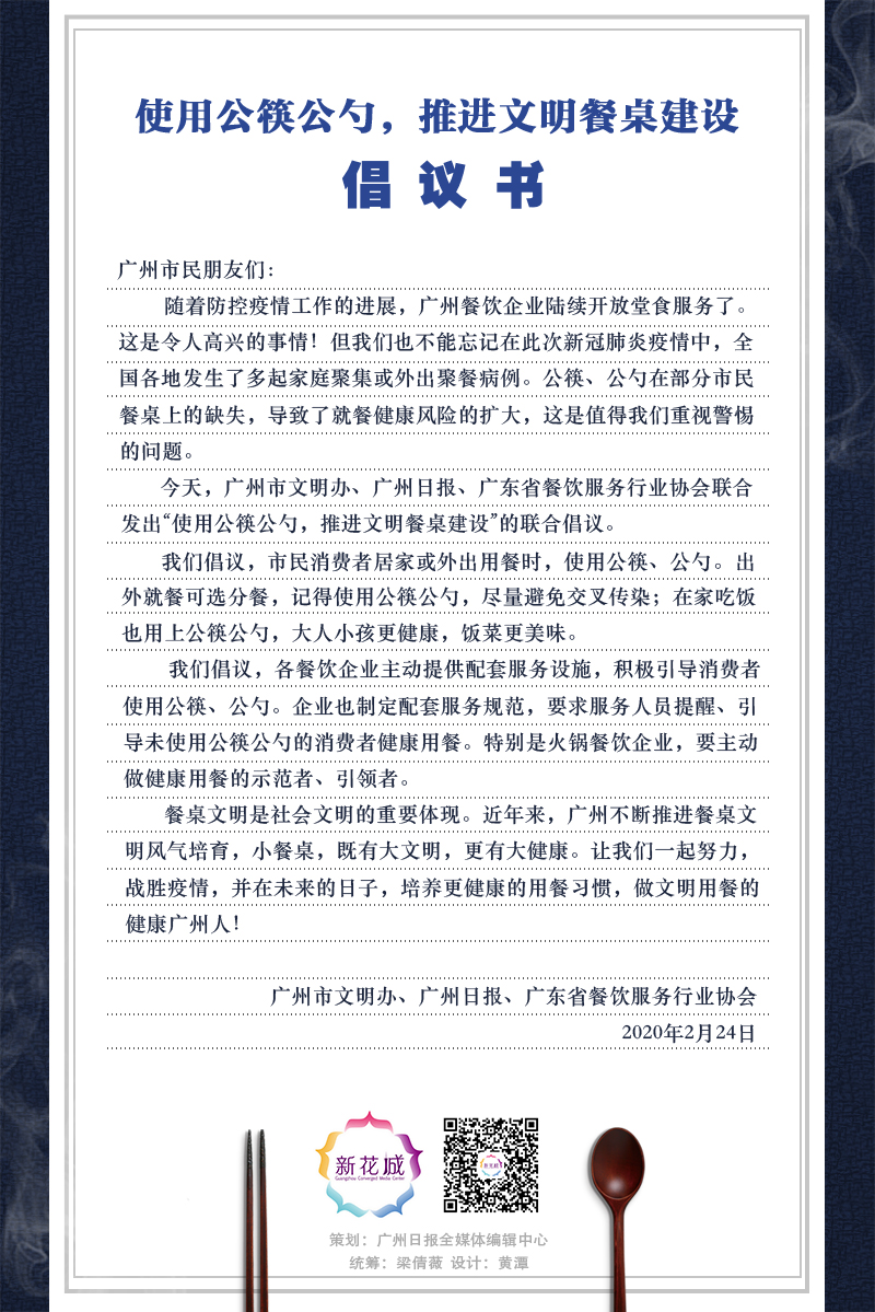 使用公筷公勺,用餐安全又文明。昨日,广州市文明办、广州日报、广东省餐饮服务行业协会联合发出“使用公筷公勺,推进广州文明餐桌建设”的倡议,倡议市民消费者居家或外出用餐时,使用公筷公勺;倡议各餐饮企业主动提供配套服务设施,积极引导消费者使用公筷公勺。与此同时,广州龙头餐饮企业广州酒家集团、九毛九集团旗下品牌九毛九西北菜、太二酸菜鱼等多家餐厅表示加入共同倡议,支持使用公筷公勺。