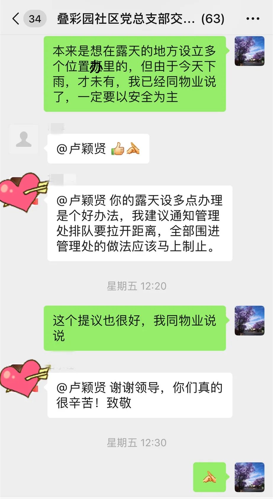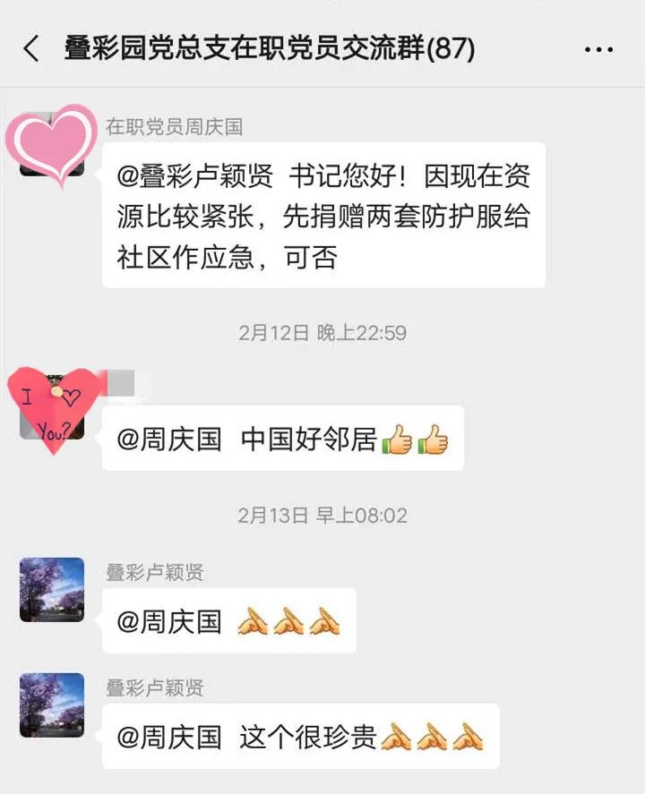 为方便开展疫情防控工作,叠彩园社区党总支部书记卢颖贤利用两个党员志愿者微信群,一个是社区党员志愿者群,一个是在职党员志愿者群。两个群内的100余名党员在疫情防控期间充分发挥基层党组织战斗堡垒作用,凝聚党心民心扎实地协助居委开展防疫工作,不仅为居委的工作减小了压力,同时更加便捷地服务了居民。