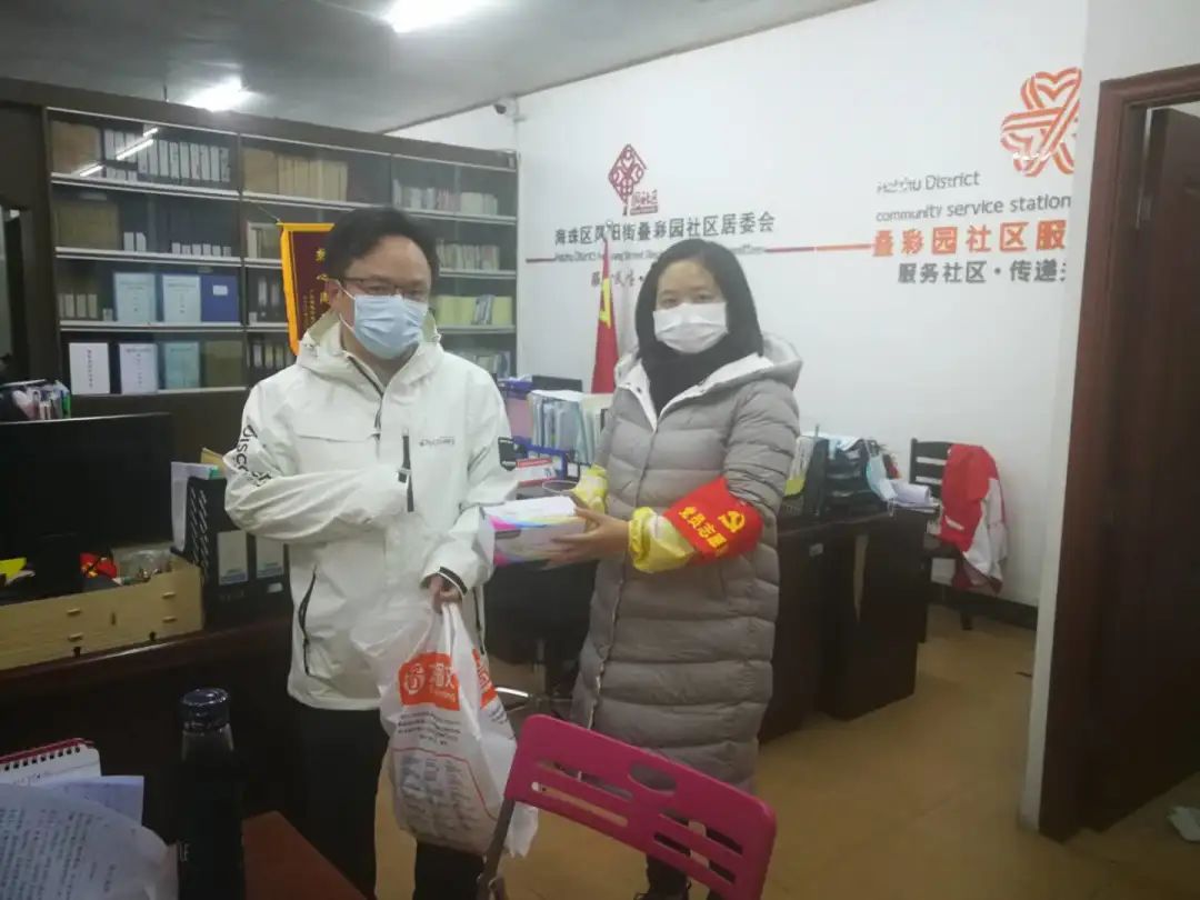 2月16日,在职党员周庆国、陈斯敏、钟智军、韩子英等同志得知社区“三人小组”在上门排查工作中,需要为部分人员现场进行核酸检测抽样工作,但是防御物资不足后,分别捐赠了医用口罩、防护衣、一次性浴帽、消毒物品、药物等给上门排查的工作人员。“工作虽重,也遇到各种困难和不理解的群众,但心善之人还是围绕着我们,给予我们每一个基层社区工作者暖心的爱,让我们在疫情中更加坚定信念,以积极认真的态度,打赢这场‘战疫’!”叠彩园居委会工作人员感动地说。