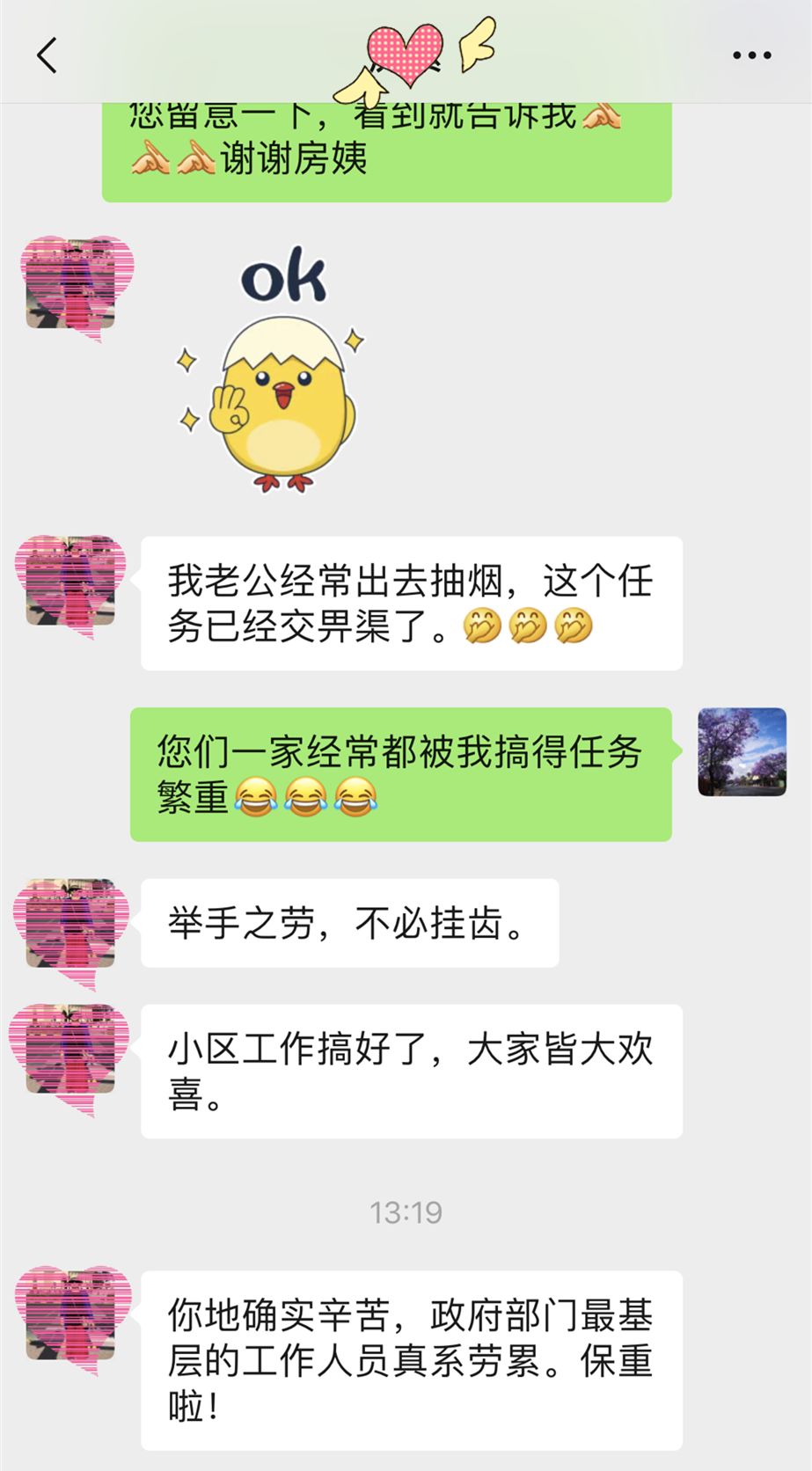“利用党员微信群是为了方便居委开展工作,疫情防控期间做了什么工作,我们就会在群里说说,让党员们了解实际情况后做一个正面的宣传。因为我们一个社区居民群就有500人,几个群加起来几千人,要是我们说一句话或两句话,可能会有几千人在发问,那这个时候我们的消息很快就会被覆盖。而且党员也是我们的住户,他们分别住在不同的楼宇,加入的是不同的群,由党员同志向广大居民作解释工作会更有说服力,收集信息也更加便捷。”卢颖贤介绍道,“如果其他居民反馈意见给他们,他们还会帮助我们进行分类、过滤,这样的话我们的工作量就会减轻了,而且收到的信息都是比较有针对性的。”