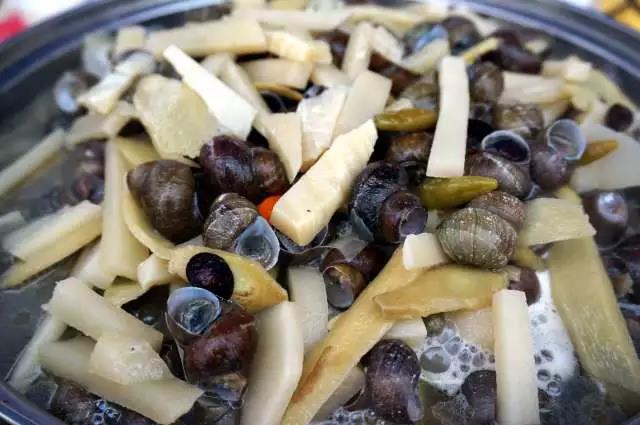 将田螺洗净,滴几滴芝麻油静置一夜后再清洗一次,它把体内的泥沙脏物吐净。起花生油锅,爆香蒜蓉和辣椒圈后,将处理好的田螺投入锅中大火翻炒至它尾部的“盖子”打开。投适量的酸笋、泡椒、鲜紫苏、生抽进去,继续翻炒片刻加水煮沸,转砂锅继续炖煮至汁液渐收时加少许盐即可起锅装盘。