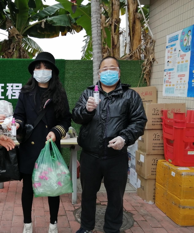 由于缺乏足够的疫情防控防护用品,黄燕舞绞尽脑汁为社区筹集防护物资。最终经过多方询问亲朋好友,才得以购买了84消毒液一箱,消毒粉10包,口罩260个,并把它们捐赠给在门岗一线的物管公司工作人员,用实实在在的温暖行动告诉他们“这场战斗不孤单”。