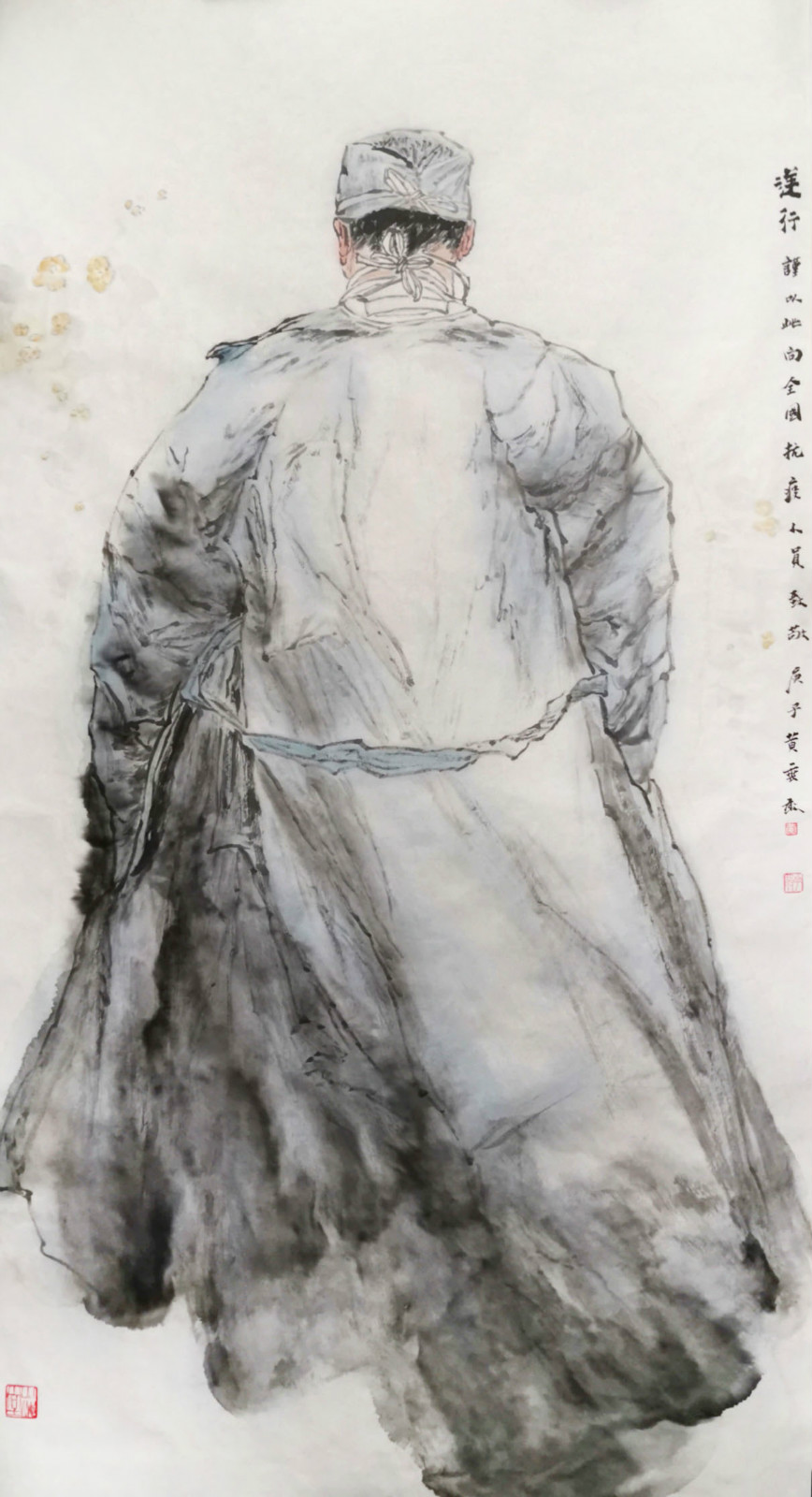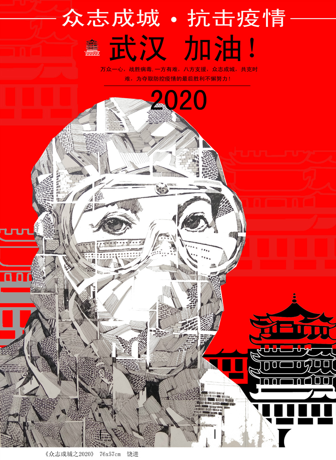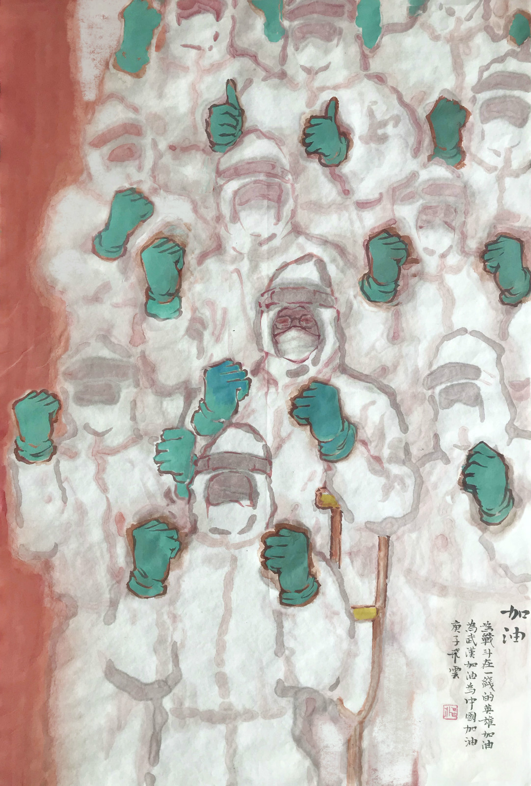 创作感言:医生不顾个人安危,冲在战“疫”的最前方,我深深为他们的壮举所感动。这幅作品描绘了身穿安全装备的医生们,集结奔赴前线的场景,画中的背景运用墨色进行渲染,并把蝙蝠的形象融入到里面去,烘托出当前的疫情。我把作品命名为:真正的猛士,向白衣战士们致以崇高的敬意!